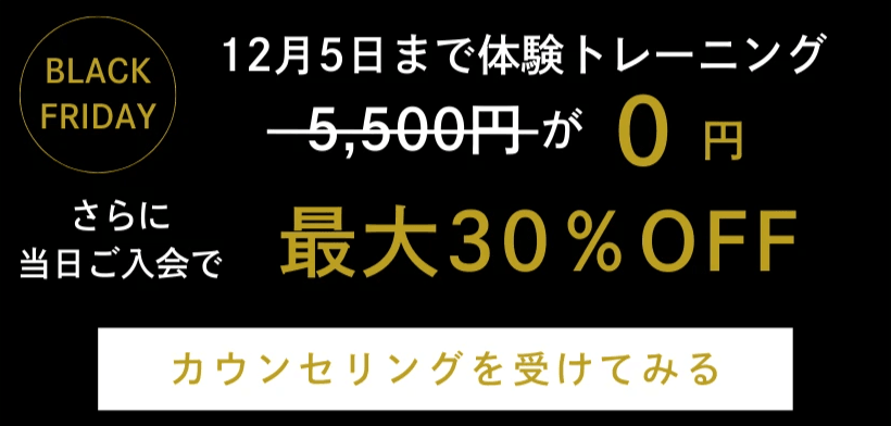 無料カウンセリング、体験トレーニング後当日にご入会いただく場合は最大20%OFFでご案内をさせていただきます。