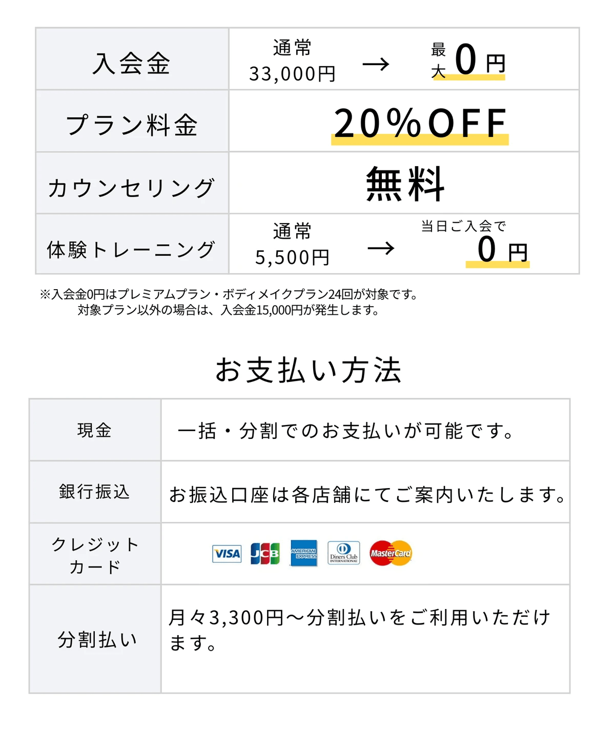 無料カウンセリング当日でのご入会で入会金最大半額、体験トレーニング料金5,500円を無料でご案内させていただきます。